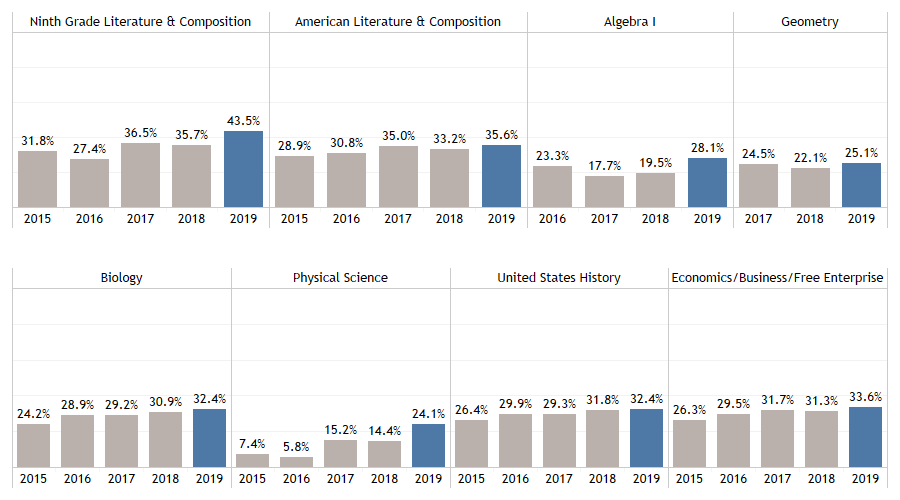 In 2019, APS also achieved year-on-year gains in the percentage of students scoring proficient and above on all eight EOC tests. The largest year-over-year increases were in Physical Science (+9.7 percentage points), Algebra I (+8.6 percentage points), and Ninth Grade Literature & Composition (+7.9 percentage points). See Figure 3.