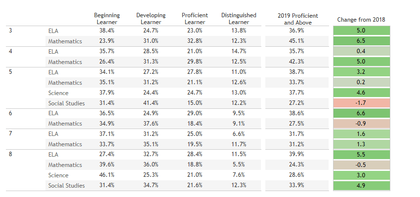 By grade, the largest increases were 6th grade ELA (+6.6 percentage points), 3rd grade Math (+6.5 percentage points) and 8th grade ELA (+5.5 percentage points). Fifth grade Social Studies and 6th and 8th grade Math had slight decreases in 2019 proficiency levels compared to 2018 as shown on Table 1.