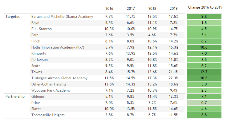 Our Turnaround Strategy, launched in 2016 with a focus on the lowest-performing schools, has also seen achievement. Since the Turnaround Strategy was fully implemented, the initial cohort of 17 targeted and partnership schools have all achieved increases in the percentage of students scoring proficient and above on the Georgia Milestones. Three schools have achieved double-digit increases when comparing the 2019 results to spring 2016. See Table 2.
